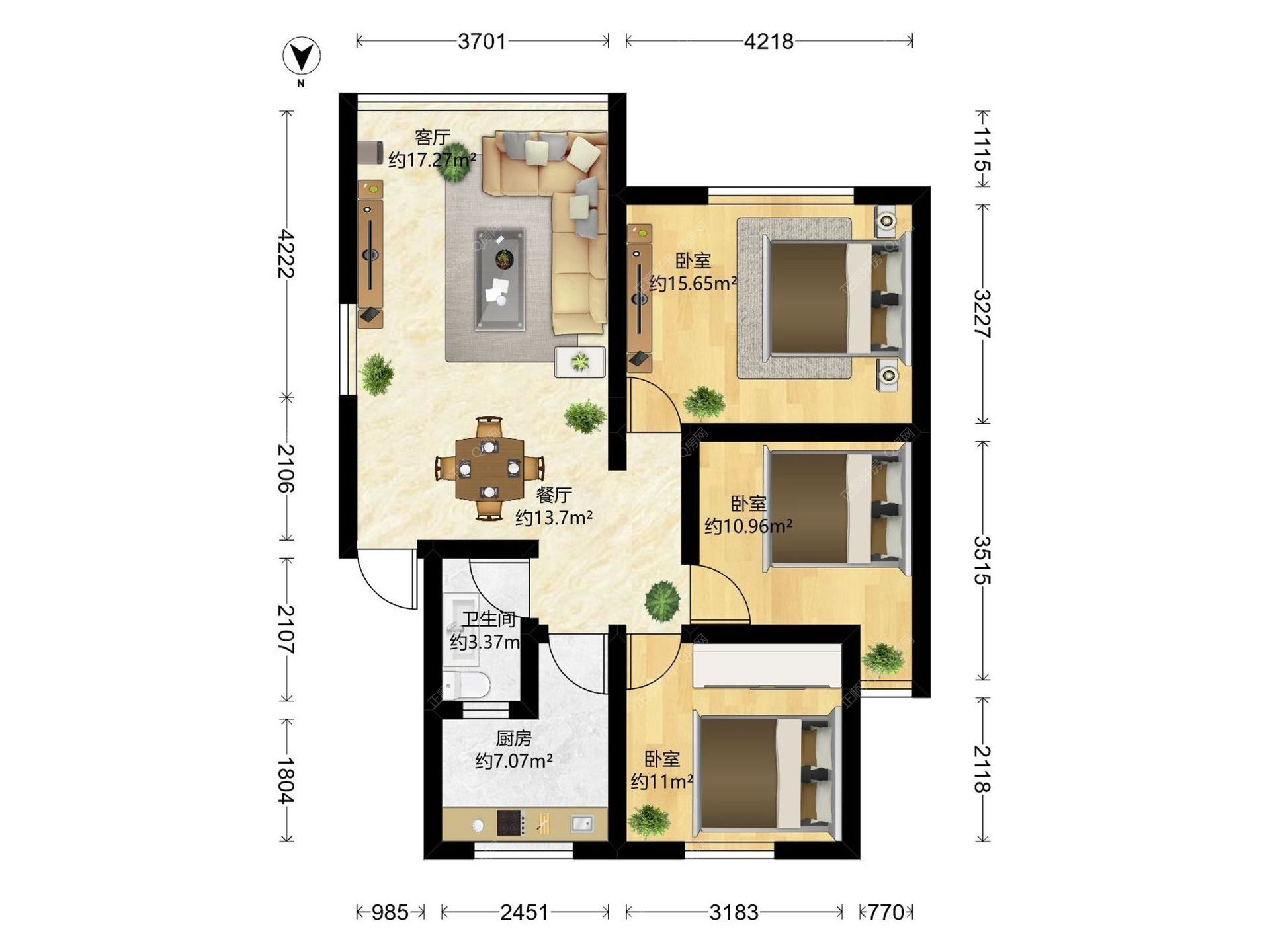 3.三房两厅,朝南向,格局方正,通风好,非常安静